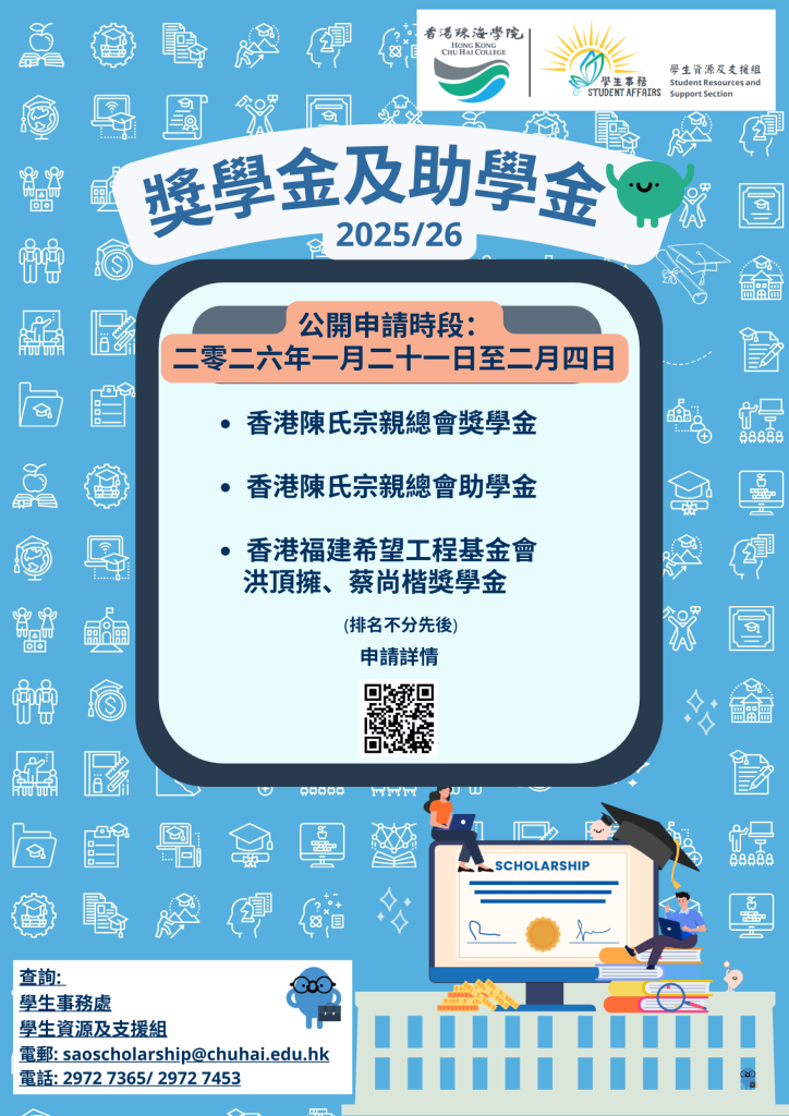 有興趣申請的同學,可 按此瀏覽詳情及網上申請 (請用學生電郵,即「學生編號 9位數字」 + 「@student.chuhai.edu.hk」登入),以了解各個獎、助學金的申請章則。