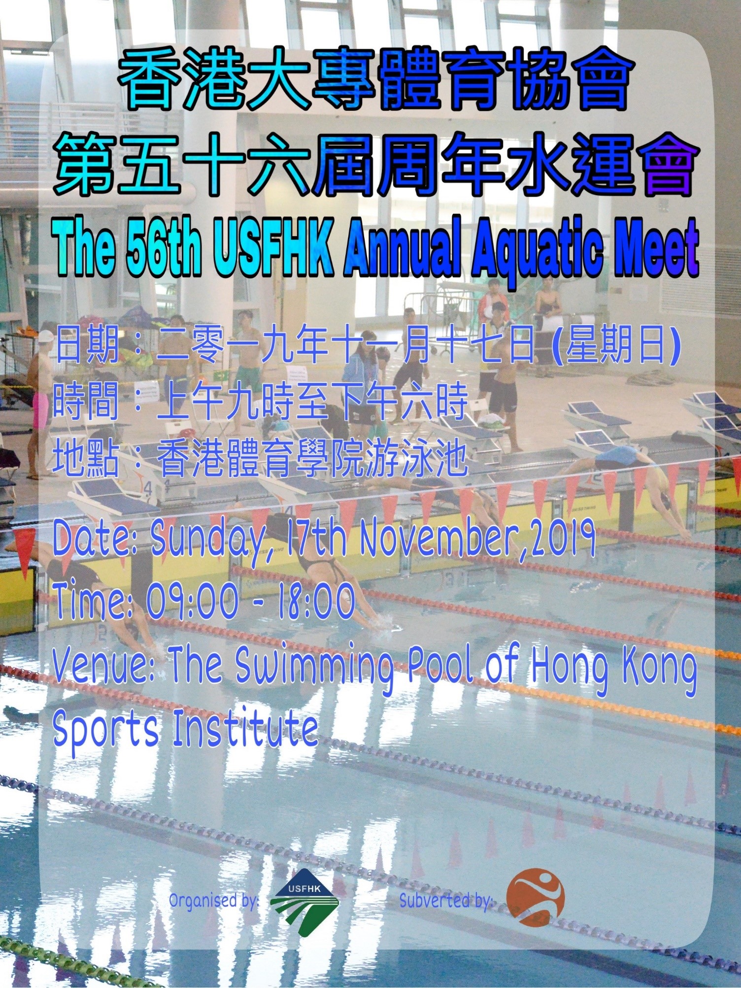 2019-2020 Events External Sports Activity & Competition Homepage PE Recent Announcements 香港大專體育協會第五十六屆周年水運會 The 56th USFHK Annual Aquatic Meet by saojob|Published 30 September 2019-Updated 4 September 2020