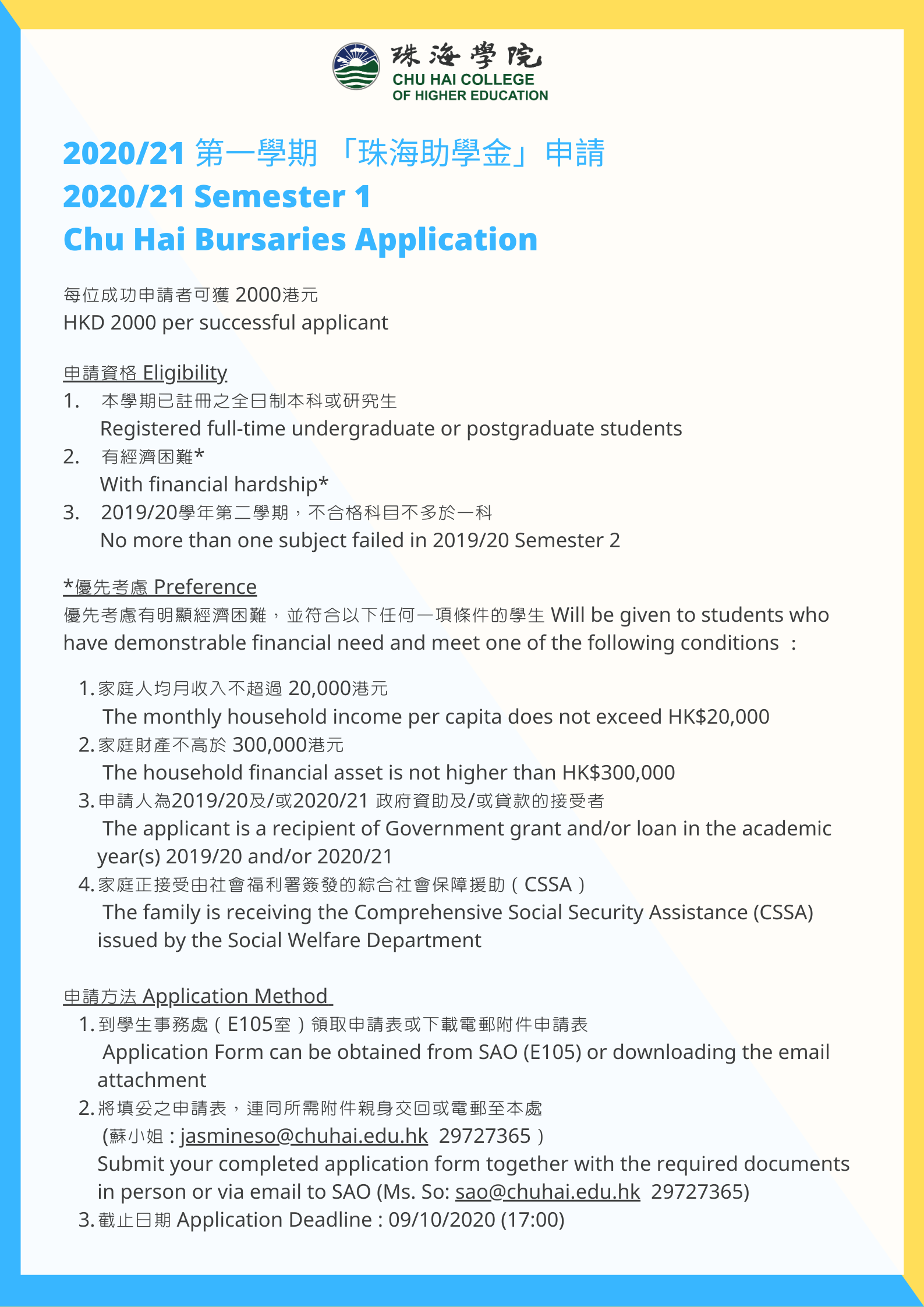 2020-21 Events Homepage 2020/21 Semester 1 Chu Hai Bursaries Application by saoeditor|Published 30 September 2020 2020-21 Sem1 珠海助學金申請表格 Chu Hai Bursaries Application Form