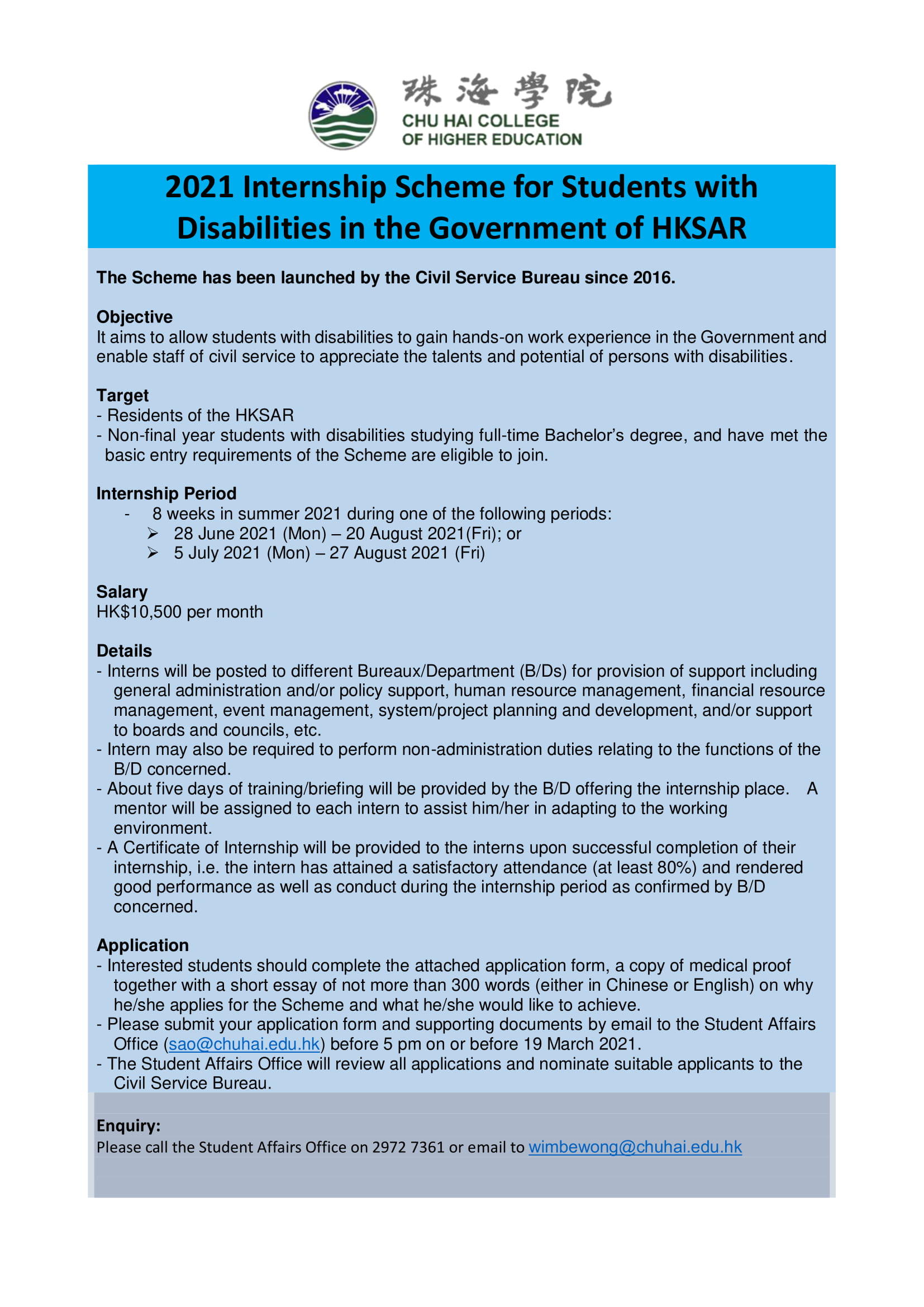 2020-21 Events Career Development Internships 2021 Internship Scheme for Students with Disabilities in the Government of HKSAR by saojob|Published 2 March 2021