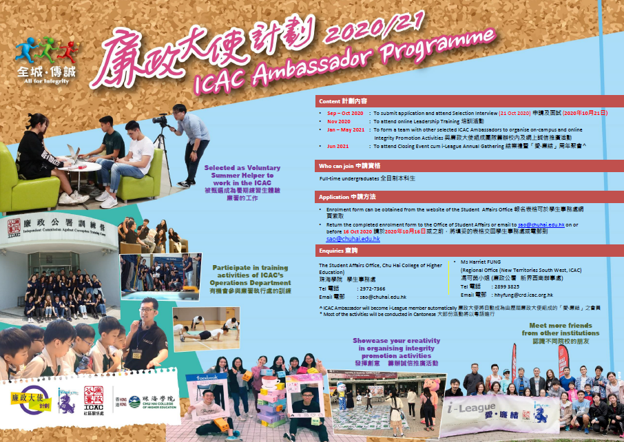 Please sign up for the ICAC Ambassador Programme 2020-21. You can meet friends of the College and other institutions, demonstrate your creativity and team work in running activities and may get an opportunity in working as a voluntary summer helper in the ICAC.