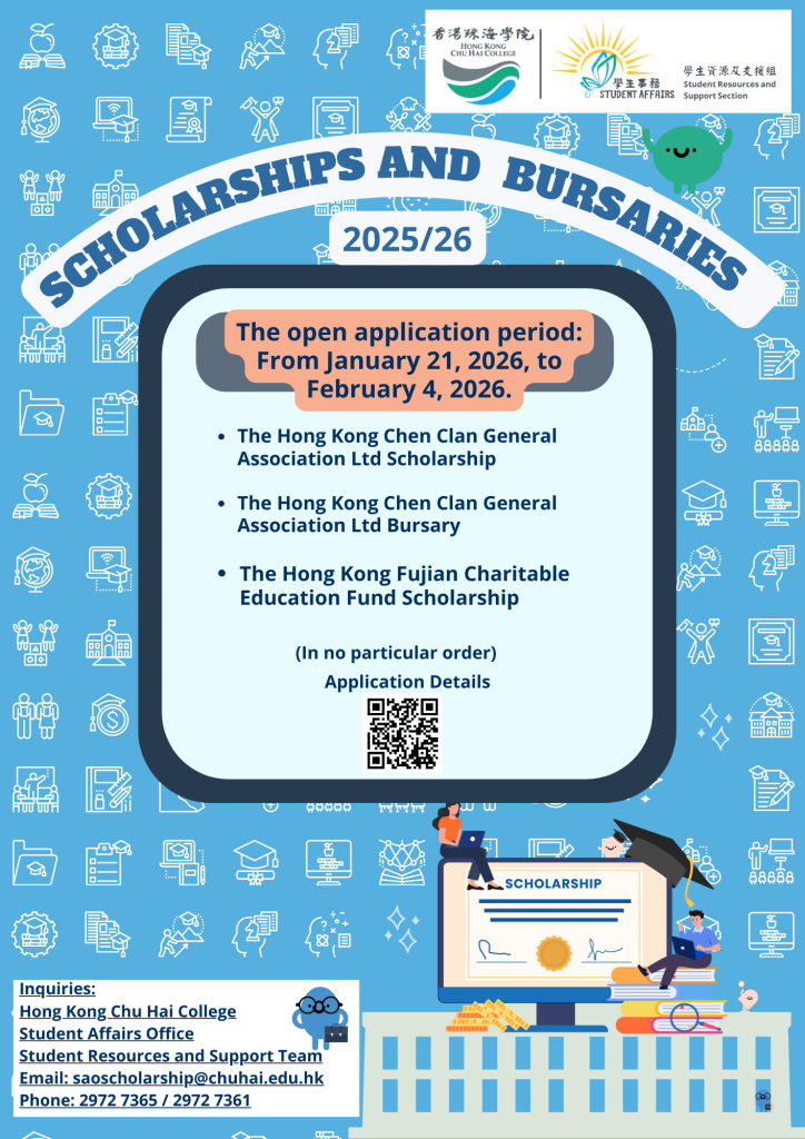 Hong Kong Chu Hai College Scholarships and Bursaries (Fall Semester) 2025/26The first round of applications for the “Hong Kong Chu Hai College Scholarships and Bursaries 2025/26” is opening for public submission. We hereby extend our sincere gratitude to all donors for their generous support. An overview of the scholarships and bursaries for this cycle is provided below: