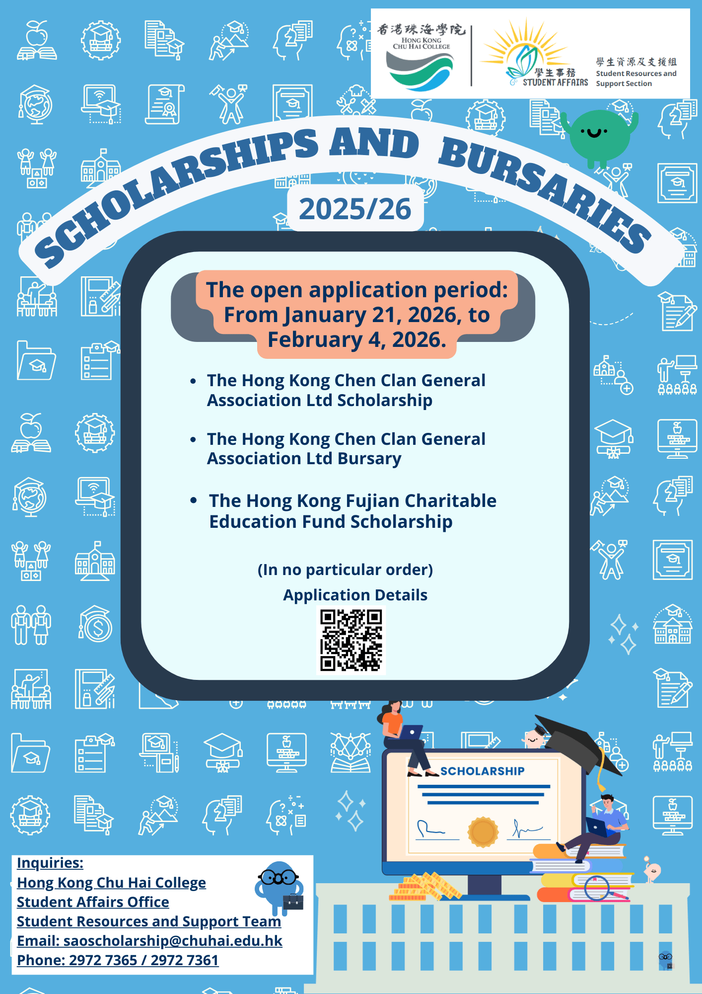 | 1 | From January 21, 2026, until February 4, 2026 | The Hong Kong Chen Clan General Association Ltd Scholarship | ✓ | ✓ | For Chen’s clansmen students ONLY |