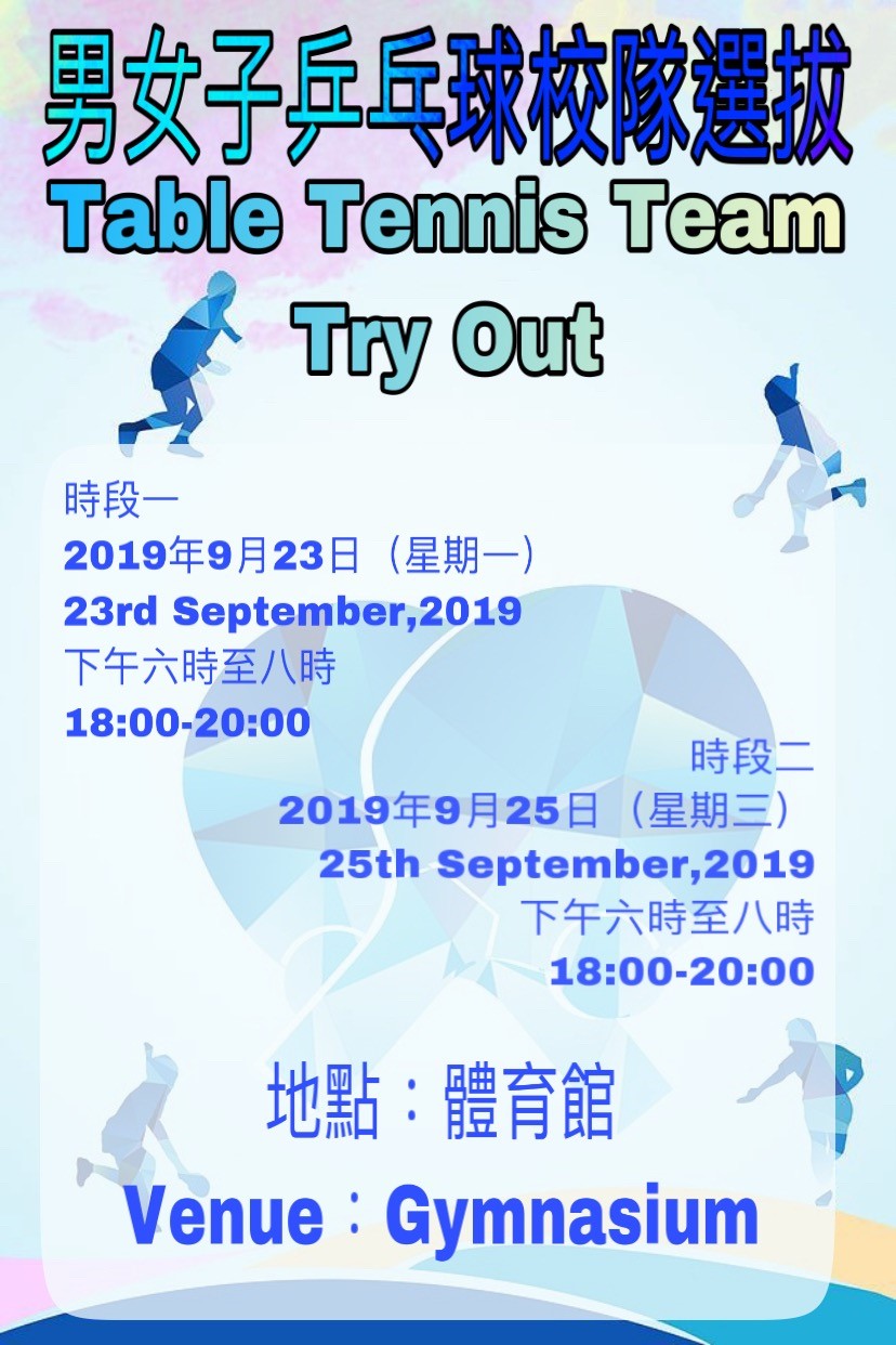 2019-2020 Events Homepage PE Recent Announcements Uncategorized 男女子乒乓球校隊選拔Table Tennis Team Try Out by saojob|Published 17 September 2019-Updated 4 September 2020