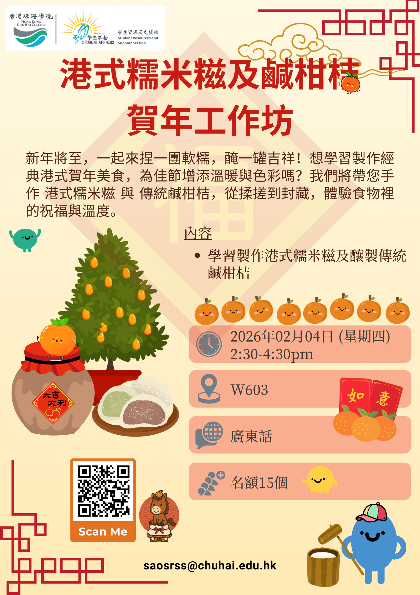 新年将至,一起来捏一团软糯,腌一罐吉祥!想学习制作经典港式贺年美食,为佳节增添温暖与色彩吗?我们将带您手作 港式糯米糍 与 传统咸柑桔,从揉搓到封藏,体验食物里的祝福与温度。